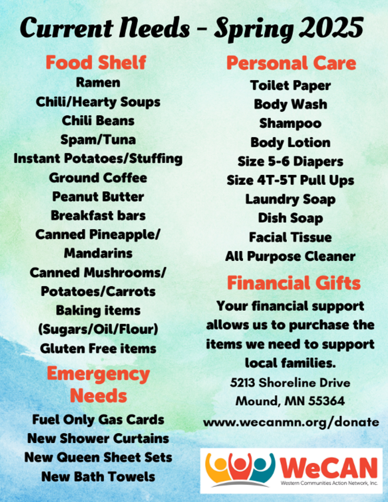 All 3v3 participants are encouraged to bring non-perishable food or personal care items in support of WeCAN - a community nonprofit that empowers and equips individuals and families to reach stability and self-sufficiency headquartered in Mound. For each item you donate, you will receive a raffle ticket. At the end of the event, we will draw a winning ticket good for a free registration for the 26/27 competitive season!